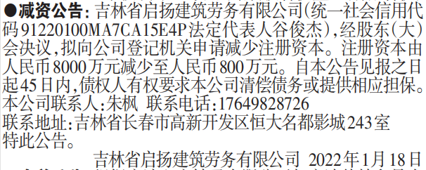 吉林省启扬建筑劳务有限公司(统一社会信用代码91220100MA7CA15E4P法定代表人谷俊杰),经股东(大)会决议,拟向公司登记机关申请减少注册资本。注册资本由人民币8000万元减少至人民币800万元。自本公告见报之日起45日内,债权人有权要求本公司清偿债务或提供相应担保。