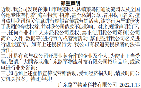 近期,我公司发现在佛山市顺德区乐从镇菜鸟陆通物流园以及全国各地专线有打着“路军物流”招牌,甚至私刻公章,冒用我司名义,擅自盗用我司相关信息进行虚假宣传或营销活动,该等行为严重侵害了我司的合法权益,并对我公司造成不良影响。对此,郑重声明如下: