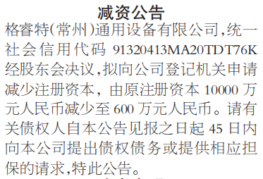 格睿特(常州)通用设备有限公司,统一社会信用代码91320413MA20TDT76K经股东会决议,拟向公司登记机关申请减少注册资本,由原注册资本10000万元人民币减少至600万元人民币。请有关债权人自本公告见报之日起45日内向本公司提出债权债务或提供相应担保的请求,特此公告。