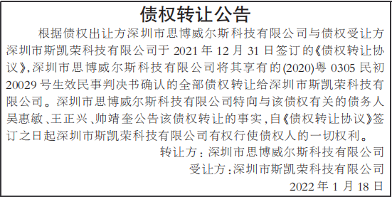 根据债权出让方深圳市思博威尔斯科技有限公司与债权受让方深圳市斯凯荣科技有限公司于2021年12月31日签订的《债权转让协议》,深圳市思博威尔斯科技有限公司将其享有的(2020)粤0305民初20029号生效民事判决书确认的全部债权转让给深圳市斯凯荣科技有限公司。深圳市思博威尔斯科技有限公司特向与该债权有关的债务人吴惠敏、王正兴、帅靖奎公告该债权转让的事实,自《债权转让协议》签订之日起深圳市斯凯荣科技有限公司有权行使债权人的一切权利。