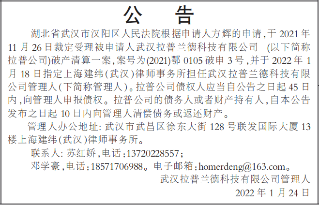 湖北省武汉市汉阳区人民法院根据申请人方辉的申请,于2021年11月26日裁定受理被申请人武汉拉普兰德科技有限公司(以下简称拉普公司)破产清算一案,案号为(2021)鄂0105破申3号,并于2022年1月18日指定上海建纬(武汉)律师事务所担任武汉拉普兰德科技有限公司管理人(下简称管理人)。拉普公司债权人应当自公告之日起45日内,向管理人申报债权。拉普公司的债务人或者财产持有人,自本公告发布之日起10日内向管理人清偿债务或返还财产。