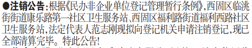 根据《民办非企业单位登记管理暂行条例》,西固区临洮街街道康乐路第一社区卫生服务站、西固区福利路街道福利西路社区卫生服务站,法定代表人范志刚现拟向登记机关申请注销登记,现已全部清算完毕。特此公告!