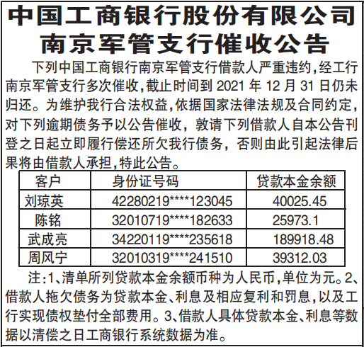 下列中国工商银行南京军管支行借款人严重违约,经工行南京军管支行多次催收,截止时间到2021年12月31日仍未归还。为维护我行合法权益,依据国家法律法规及合同约定,对下列逾期债务予以公告催收,敦请下列借款人自本公告刊登之日起立即履行偿还所欠我行债务,否则由此引起法律后果将由借款人承担,特此公告。
