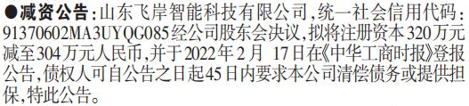 山东飞岸智能科技有限公司,统一社会信用代码:91370602MA3UYQG085经公司股东会决议,拟将注册资本320万元减至304万元人民币,并于2022年2月17日在《中华工商时报》登报公告,债权人可自公告之日起45日内要求本公司清偿债务或提供担保,特此公告。