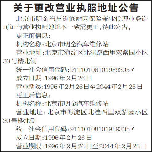 北京市明金汽车维修站因保险兼业代理业务许可证与营业执照地址不一致需更正,特此公告。