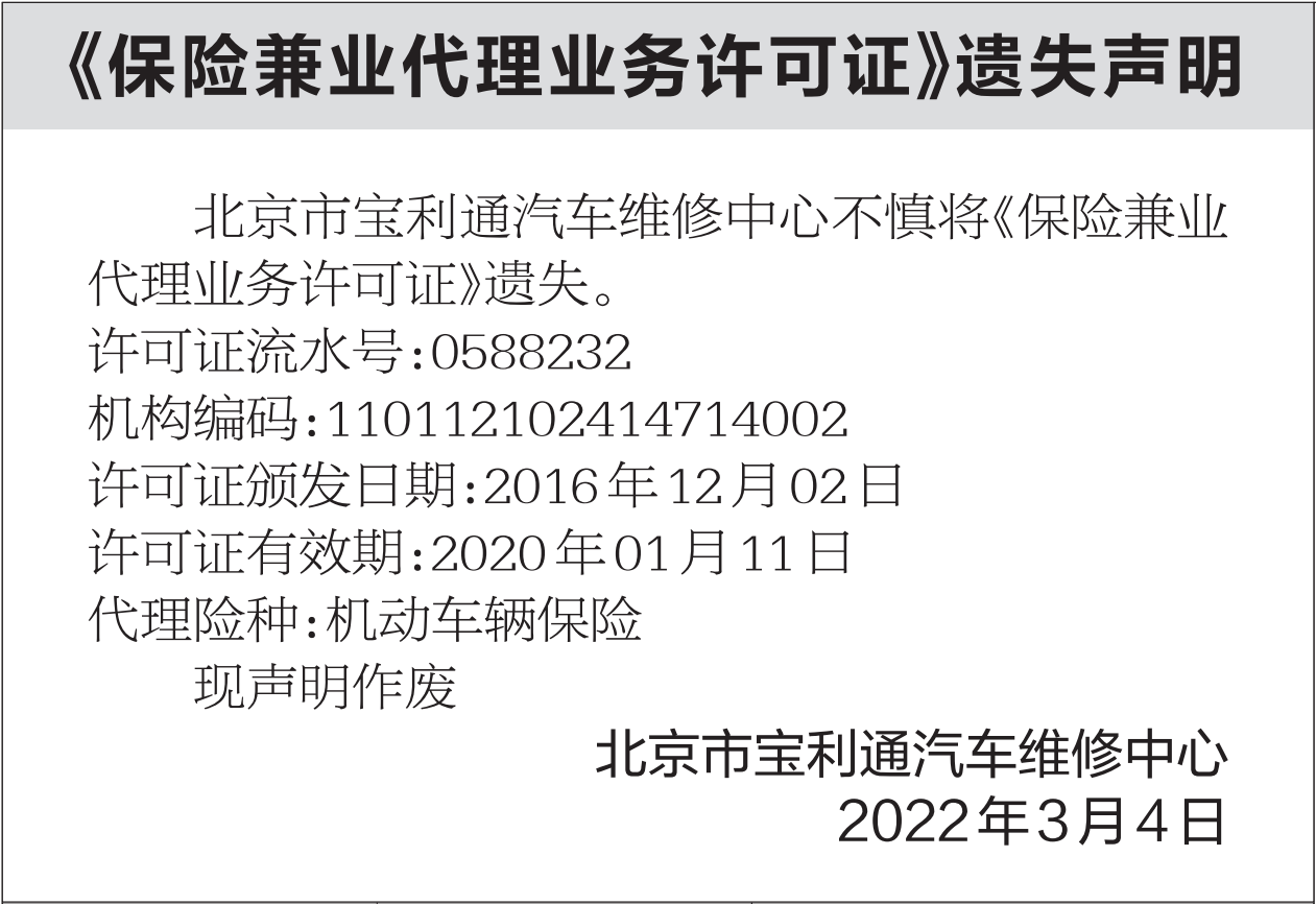 《保险兼业代理业务许可证》遗失声明_国际商报
