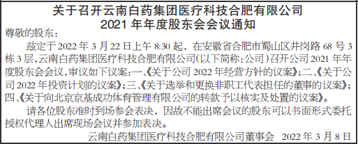 兹定于2022年3月22日上午8:30起,在安徽省合肥市蜀山区井岗路68号3栋3层,云南白药集团医疗科技合肥有限公司(以下简称:公司)召开公司2021年年度股东会会议,审议如下议案:一、《关于公司2022年经营方针的议案》;二、《关于公司2022年投资计划的议案》;三、《关于选举和更换非职工代表担任的董事的议案》;四、《关于向北京京基成功体育管理有限公司的转款予以核实及处置的议案》。