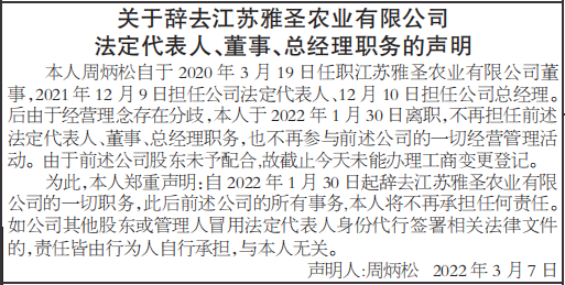 本人周炳松自于2020年3月19日任职江苏雅圣农业有限公司董事,2021年12月9日担任公司法定代表人、12月10日担任公司总经理。后由于经营理念存在分歧,本人于2022年1月30日离职,不再担任前述法定代表人、董事、总经理职务,也不再参与前述公司的一切经营管理活动。由于前述公司股东未予配合,故截止今天未能办理工商变更登记。