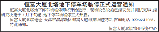 恒富大厦北塔地下停车场临停正式运营通知