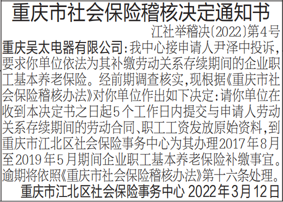 重庆吴太电器有限公司:我中心接申请人尹泽中投诉,要求你单位依法为其补缴劳动关系存续期间的企业职工基本养老保险。经前期调查核实,现根据《重庆市社会保险稽核办法》对你单位作出如下决定:请你单位在收到本决定书之日起5个工作日内提交与申请人劳动关系存续期间的劳动合同、职工工资发放原始资料,到重庆市江北区社会保险事务中心为其办理2017年8月至2019年5月期间企业职工基本养老保险补缴事宜。逾期将依照《重庆市社会保险稽核办法》第十六条处理。