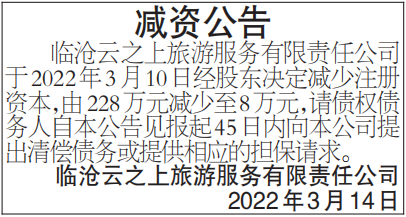 临沧云之上旅游服务有限责任公司于2022年3月10日经股东决定减少注册资本,由228万元减少至8万元,请债权债务人自本公告见报起45日内向本公司提出清偿债务或提供相应的担保请求。