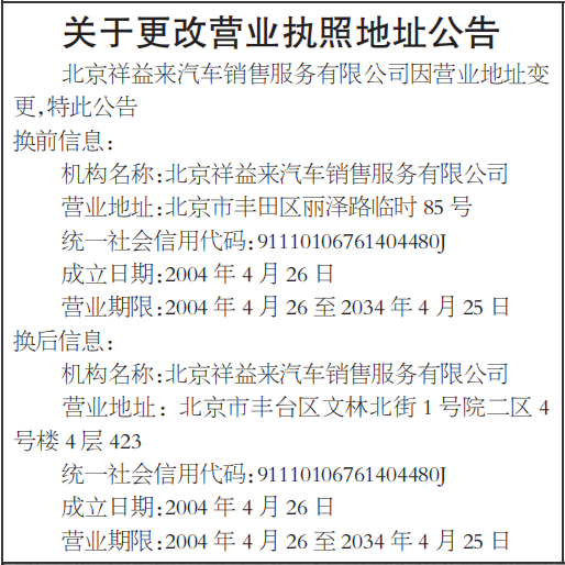北京祥益来汽车销售服务有限公司因营业地址变更,特此公告。