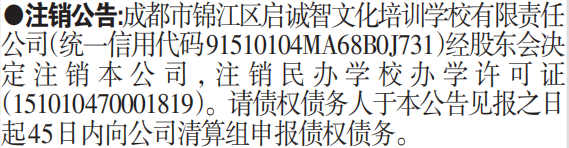 成都市锦江区启诚智文化培训学校有限责任公司(统一信用代码91510104MA68B0J731)经股东会决定注销本公司,注销民办学校办学许可证(151010470001819)。请债权债务人于本公告见报之日起45日内向公司清算组申报债权债务。