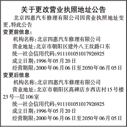 北京四惠汽车修理有限公司因营业执照地址变更,特此公告。