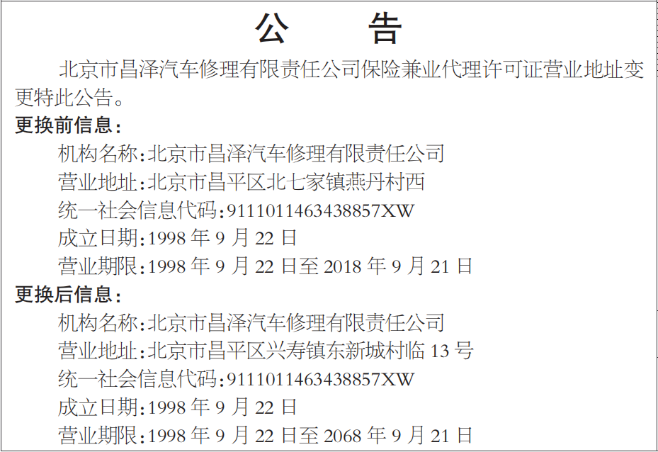 北京市昌泽汽车修理有限责任公司保险兼业代理许可证营业地址变更特此公告。