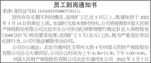 季泽(身份证号码11010519700807****):因你存在长期不到岗情况,连续旷工已达5日以上,现通知你于2022年3月14日到单位上班。如届时无故未按时到岗,公司将按照《中国人民财产保险股份有限公司北京市分公司劳动纪律管理暂行规定》(京人保财险发〔2008〕327号)相关要求处理:连续旷工5天(含)以上的,视为严重违反劳动纪律行为,公司可依法解除劳动合同。