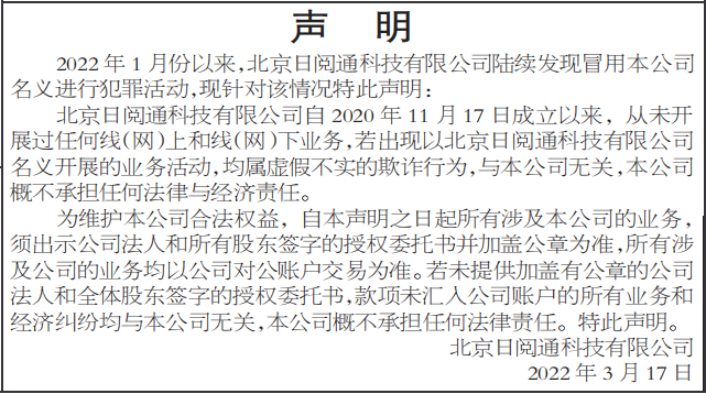 2022年1月份以来,北京日阅通科技有限公司陆续发现冒用本公司名义进行犯罪活动,现针对该情况特此声明: