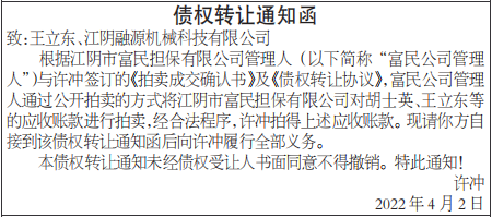 根据江阴市富民担保有限公司管理人(以下简称“富民公司管理人”)与许冲签订的《拍卖成交确认书》及《债权转让协议》,富民公司管理人通过公开拍卖的方式将江阴市富民担保有限公司对胡士英、王立东等的应收账款进行拍卖,经合法程序,许冲拍得上述应收账款。现请你方自接到该债权转让通知函后向许冲履行全部义务。