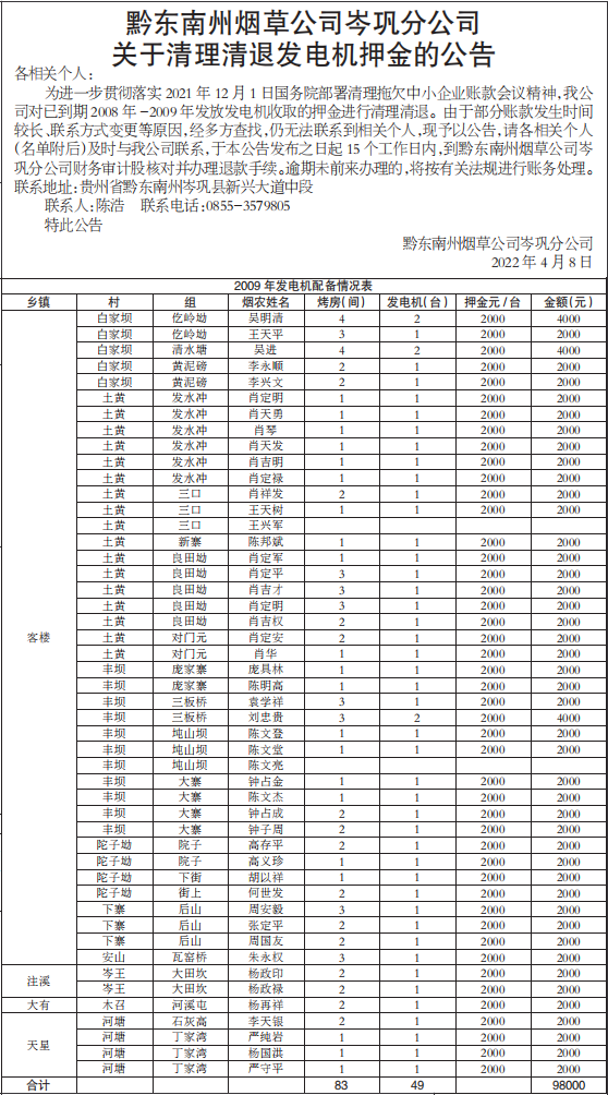 为进一步贯彻落实2021年12月1日国务院部署清理拖欠中小企业账款会议精神,我公司对已到期2008年-2009年发放发电机收取的押金进行清理清退。由于部分账款发生时间较长、联系方式变更等原因,经多方查找,仍无法联系到相关个人,现予以公告,请各相关个人(名单附后)及时与我公司联系,于本公告发布之日起15个工作日内,到黔东南州烟草公司岑巩分公司财务审计股核对并办理退款手续。逾期未前来办理的,将按有关法规进行账务处理。