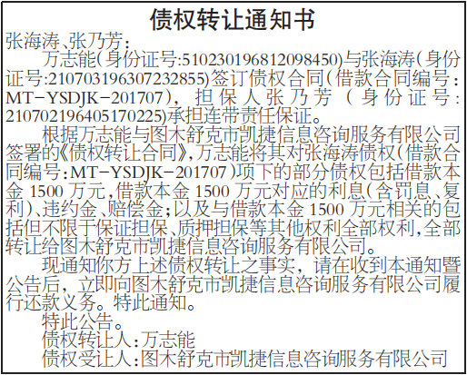 根据万志能与图木舒克市凯捷信息咨询服务有限公司签署的《债权转让合同》,万志能将其对张海涛债权(借款合同编号:MT-YSDJK-201707)项下的部分债权包括借款本金1500万元,借款本金1500万元对应的利息(含罚息、复利)、违约金、赔偿金;以及与借款本金1500万元相关的包括但不限于保证担保、质押担保等其他权利全部权利,全部转让给图木舒克市凯捷信息咨询服务有限公司。