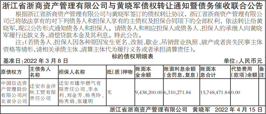 浙江省浙商资产管理有限公司与黄晓军债权转让通知暨债务催收联合公告