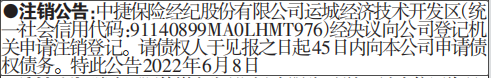 中捷保险经纪股份有限公司运城经济技术开发区(统一社会信用代码:91140899MA0LHMT976)经决议向公司登记机关申请注销登记。请债权人于见报之日起45日内向本公司申请债权债务。
