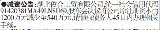 湖北俊合工贸有限公司,统一社会信用代码91420381MA49LN8U69,股东会决议将公司原注册资本由1200万元减少至540万元,请债权债务人45日内办理相关手续。