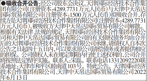 经公司股东会决议,天津国际经济技术合作集团有限公司(注册资本:4289.7731万元人民币)与天津中天帛达国际贸易有限公司(注册资本:1500万元人民币)拟吸收合并,存续方是天津国际经济技术合作集团有限公司(注册资本:4289.7731万元人民币),被吸收方天津中天帛达国际贸易有限公司解散。根据有关法律、法规的规定,天津国际经济技术合作集团有限公司和天津中天帛达国际贸易有限公司的有关债权债务均由合并后的天津国际经济技术合作集团有限公司承继,请债权人自本次公告之日起四十五日内,可以要求原公司清偿债务或者提供相应的担保。公司债权人未在规定期限内行使上述权利的,公司合并将按照法定程序实施。联系人:宋磊。联系电话13312092220联系地址:天津市和平区睦南道103号。