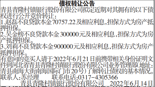 有意向的竞买人请于2022年6月21日前携带相关身份证明文件到河北省青县青隆村镇银行股份有限公司业务管理部(地址:青县南海大街南海国际门市20号)了解转让债权的基本情况。