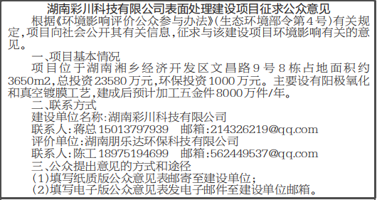 湖南彩川科技有限公司表面处理建设项目征求公众意见