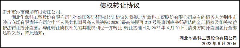湖北华鑫科工贸股份有限公司与孙盛国签订《债权转让协议》,将湖北华鑫科工贸股份有限公司享有的债务人为荆州市沙市商场有限责任公司之中华人民共和国最高人民法院(2020)最高法民再213号民事判决书所确认的全部债权及相关权益依法转让给孙盛国。与此转让债权相关的其他权利也一并转让,转让基准日为2022年6月20日,请贵方向孙盛国履行全部还款义务。