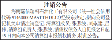 海南嘉信瑞科石油化工有限公司(统一社会信用代码91460000MA5TTHDL12)经股东决定,拟向公司登记机关申请注销登记,清算组成员:张燕波、刘崇建、吕伟,清算组负责人:张燕波,请债权债务人自见报之日起45日内向本公司清算组申报债权债务,特此公告。