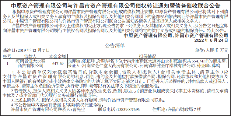 根据中原资产管理有限公司与许昌市资产管理有限公司达成的债权转让安排,中原资产管理有限公司已将其对下列债务人及其担保人或相关义务人享有的主债权及担保合同以及其他相关合同项下的全部权利依法转让给许昌市资产管理有限公司。中原资产管理有限公司与许昌市资产管理有限公司联合公告通知各债务人及其担保人或相关义务人。