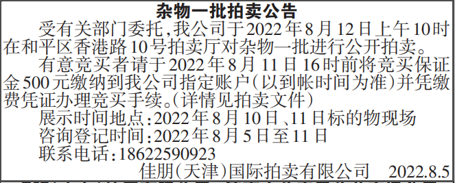 受有关部门委托,我公司于2022年8月12日上午10时在和平区香港路10号拍卖厅对杂物一批进行公开拍卖。