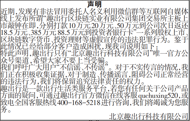 近期,发现有非法冒用委托人名义利用微信群等互联网自媒体线上发布所谓“趣出行区块链实业有限公司集团交易所主板上市敲钟在即,分别打款10万元20万元、50万元到公司次日返还18.5万元、385万元88.5万元到投资者银行卡”一系列股权上市、区块链数字货币、投资理财等虚假宣传的违法犯罪行为。鉴于此情况已经给部分客户造成困扰,现我司说明如下: