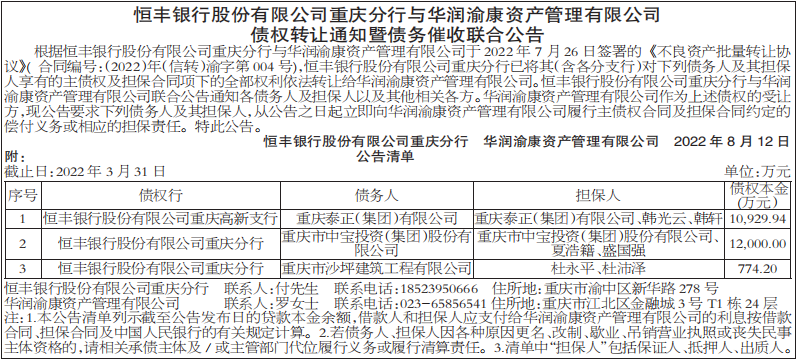 根据恒丰银行股份有限公司重庆分行与华润渝康资产管理有限公司于2022年7月26日签署的《不良资产批量转让协议》(合同编号:(2022)年(信转)渝字第004号),恒丰银行股份有限公司重庆分行已将其(含各分支行)对下列债务人及其担保人享有的主债权及担保合同项下的全部权利依法转让给华润渝康资产管理有限公司。恒丰银行股份有限公司重庆分行与华润渝康资产管理有限公司联合公告通知各债务人及担保人以及其他相关各方。华润渝康资产管理有限公司作为上述债权的受让方,现公告要求下列债务人及其担保人,从公告之日起立即向华润渝康资产管理有限公司履行主债权合同及担保合同约定的偿付义务或相应的担保责任。