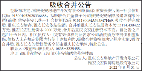 经股东决定,重庆长安房地产开发有限公司(简称:重庆长安),统一社会信用代码:915001052028336688,拟吸收合并全资子公司雅安长安保障房建设有限公司(简称:雅安长安),统一社会信用代码:91511800MA693M7H69,吸收合并完成后,重庆长安续存,雅安长安依法注销。合并前重庆长安注册资本为33114.438422万元,雅安长安注册资本2000万元,合并后重庆长安注册资本不变。自公告之日起四十五日内,相关债权人可凭有效债权凭证要求公司清偿债务或提供相应担保,债权人未在规定期限内行使上述权利的,吸收合并将按照法定程序实施,吸收合并后,雅安长安的债权债务全部由重庆长安承继,特此公告。