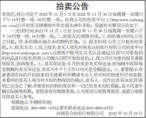 一、拍卖时间:2022年11月1日至2022年11月30日每周周一至周六下午14时整一场,18时整一场。二、拍卖方式:网络拍卖。三、标的展示时间:公告之日起。四、标的展示地点:标的物所在地。五、报名时间:公告之日起至拍卖前。六、报名方式:1、线上报名:竞买人须在河南易众拍卖行有限公司拍卖平台(http:www.yizhongcar.com),注册用户账号且实名认证通过后,即可对要参拍的拍品进行报名,经我公司确认后即可参加竞拍。2、我公司可为意向报名者提供报名、咨询服务。七、竞买保证金:本月拍卖会竞买保证金,按每辆车收取规定数额的竞买保证金,竞买不中7个工作日内无息全额退还。八、重要提示:有意者请在标的开拍前亲自实地看样并聘请专业人员对标的物进行仔细查勘,未看样的竞买人视为对本标的物现状的确认,竞买人一旦作出竞买决定,即表明已完全已了解,并接受标的物的现状和一切已知及未知的瑕疵。表不代表车辆实际驶里程数。里程表存在维修更换、人为更改公里数等原因,表显公里数仅供竞买人参考。