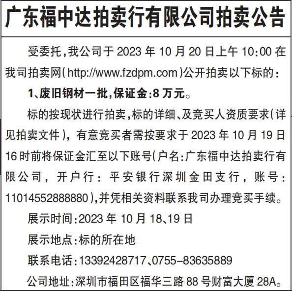 广东福中达拍卖行有限公司拍卖公告