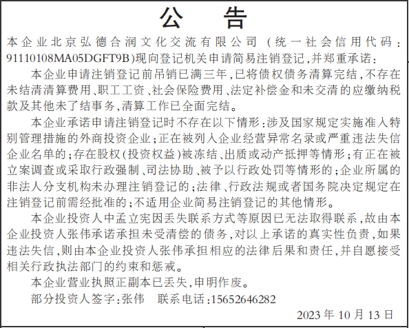本企业北京弘德合润文化交流有限公司(统一社会信用代码:91110108MA05DGFT9B)现向登记机关申请简易注销登记,并郑重承诺: