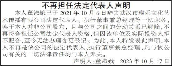 本人董淑娥已于2021年10月6日辞去武汉市璨乐文化艺术传播有限公司法定代表人、执行董事兼总经理等一切职务,鉴于本人并非公司股东,且与公司之间的劳动关系已解除,不再符合担任公司法定代表人资格,但因该单位及实际投资人拒不配合,至今无法办理变更登记。为此,本人特发表此声明,本人不再是该公司的法定代表人、执行董事兼总经理,凡与该公司有关的一切法律责任均与本人无关。