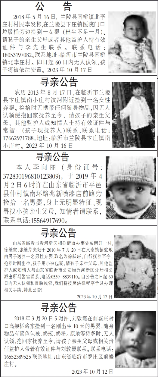 农历2013年8月17日,在临沂市兰陵县卞庄镇南小庄村汶河附近捡到一名女性弃婴。捡拾时无携带任何随身物品,因无人认领便抱回家抚养至今,请孩子的亲生父母、其他监护人或知情人士持有效证件与常智一(孩子现抚养人)联系,联系电话:17662971788,地址:临沂市兰陵县卞庄镇南小庄村。2023年10月16日