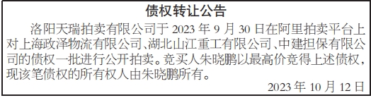 洛阳天瑞拍卖有限公司于2023年9月30日在阿里拍卖平台上对上海政泽物流有限公司、湖北山江重工有限公司、中建担保有限公司的债权一批进行公开拍卖。竞买人朱晓鹏以最高价竞得上述债权,现该笔债权的所有权人由朱晓鹏所有。