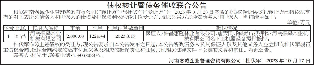 根据河南悫诚企业管理咨询有限公司(“转让方”)与杜伏军(“受让方”)于2023年9月28日签署的《债权转让协议》,转让方已将依法享有的对下表所列债务人和担保人的债权及担保权利依法转让给受让方,现以公告方式通知债务人和担保人。明细清单如下: