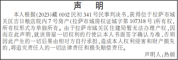 本人根据(2023)藏0102民初341号民事判决书,获得位于拉萨市城关区吉日粮店院内7号房产(拉萨市城房权证城字第107318号)所有权,所有权形式为单独所有。由于拉萨市城关区住建局暂无法办理产权,因而在此声明,就该房屋一切权利的行使以本人书面签字确认为准,否则因此产生的一切后果由相对方自行承担,造成本人权利侵害和财产损失的,将追究责任人的一切法律责任和损失赔偿责任。