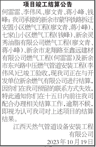 何雷雷、李伟风、廖文青、蒋小峰、钱峰:我司承接的新余市蒙华铁路拆迁安置小区燃气工程(廖文青、蒋小峰)、七家山小区燃气工程(钱峰)、新余灵秀油脂有限公司燃气工程(廖文青、蒋小峰)、新余市龙翔路至鑫远建材有限公司燃气工程(何雷雷)及新余市东兴路中压燃气管道安装工程(李伟风)已竣工验收,现我司正在与开发单位新余燃气有限公司进行结算,因你们在我司预留的联系方式失效,特此通知你们在十五日内前往我司配合办理相关结算工作,逾期不候,即视为认可我司对上述项目的结算结果。