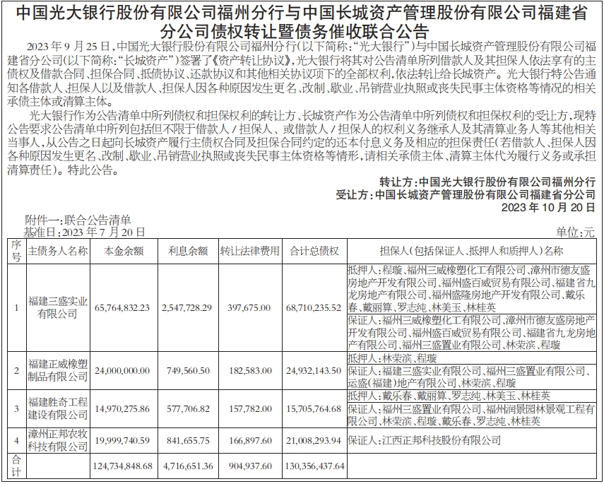 2023年9月25日,中国光大银行股份有限公司福州分行(以下简称:“光大银行”)与中国长城资产管理股份有限公司福建省分公司(以下简称:“长城资产”)签署了《资产转让协议》,光大银行将其对公告清单所列借款人及其担保人依法享有的主债权及借款合同、担保合同、抵债协议、还款协议和其他相关协议项下的全部权利,依法转让给长城资产。光大银行特公告通知各借款人、担保人以及借款人、担保人因各种原因发生更名、改制、歇业、吊销营业执照或丧失民事主体资格等情况的相关承债主体或清算主体。
