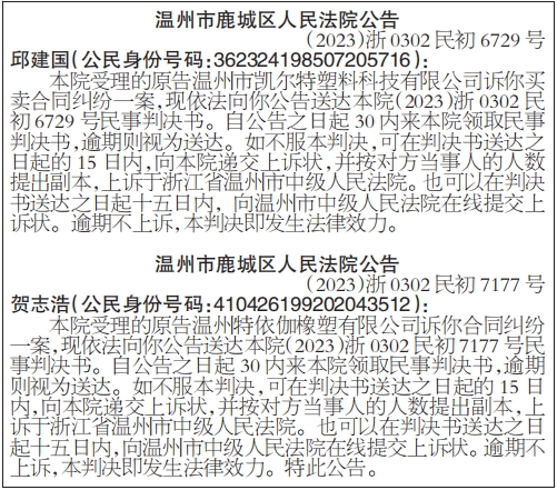 本院受理的原告温州市凯尔特塑料科技有限公司诉你买卖合同纠纷一案,现依法向你公告送达本院(2023)浙0302民初6729号民事判决书。自公告之日起30内来本院领取民事判决书,逾期则视为送达。如不服本判决,可在判决书送达之日起的15日内,向本院递交上诉状,并按对方当事人的人数提出副本,上诉于浙江省温州市中级人民法院。也可以在判决书送达之日起十五日内,向温州市中级人民法院在线提交上诉状。逾期不上诉,本判决即发生法律效力。