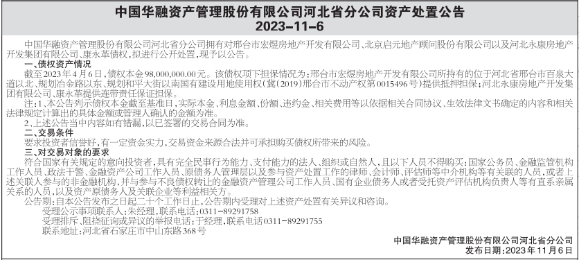 中国华融资产管理股份有限公司河北省分公司资产处置公告