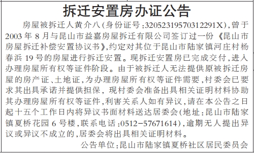 房屋被拆迁人黄介八(身份证号:32052319570312291X),曾于2003年8月与昆山市益嘉房屋拆迁有限公司签订过一份《昆山市房屋拆迁补偿安置协议书》,约定对其位于昆山市陆家镇河庄村杨春浜19号的房屋进行拆迁安置。现拆迁安置房已完成交付,进入办理房屋所有权等证件阶段。由于被拆迁人无法提供原被拆迁房屋的房产证、土地证,为办理房屋所有权等证件需要,村委会已要求其出具承诺并提供担保,现村委会准备出具相关证明材料协助其办理房屋所有权等证件,利害关系人如有异议,请在本公告之日起十五个工作日内将异议书面材料送达居委会(地址:昆山市陆家镇夏桥花园6号楼,联系电话:0512-57671614),逾期无人提出异议或异议不成立的,居委会将出具相关证明材料。